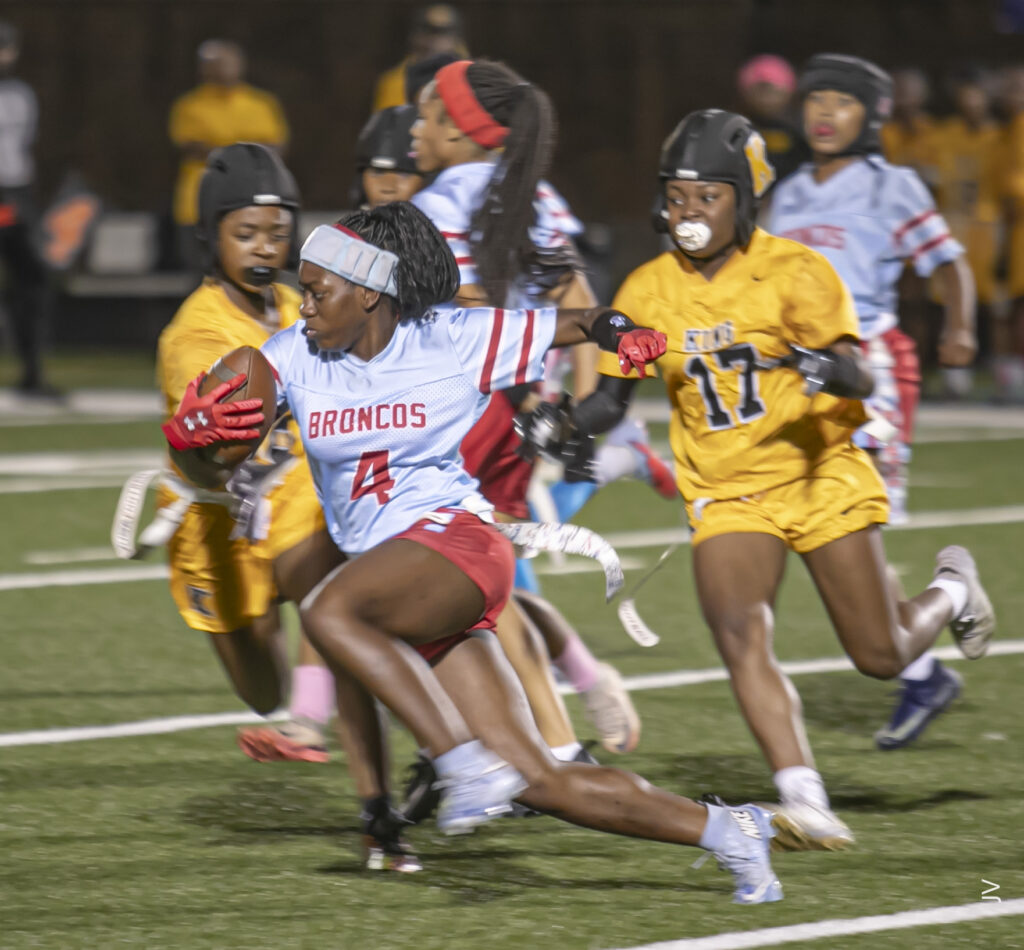 With the score tied 6-6 at halftime, the third quarter began back-and-forth with another rushing touchdown for Neal and the Jaguars, only to be followed by a highlight-reel over-the-shoulder touchdown catch for the Broncos’ Sheena Boykins from freshman quarterback Kerry Hopewell (146 yards passing, 2 touchdowns) to bring the score to a 13-12 King lead.